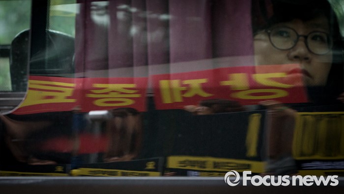 (서울=포커스뉴스) 1일 오전 서울 중구 나라키움저동빌딩 앞에서 열린 '세월호 특조위 성역없는 진상규명 조사 지속 지지 기자회견'을 인근 버스 안의 한 시민이 지켜보고 있다.
