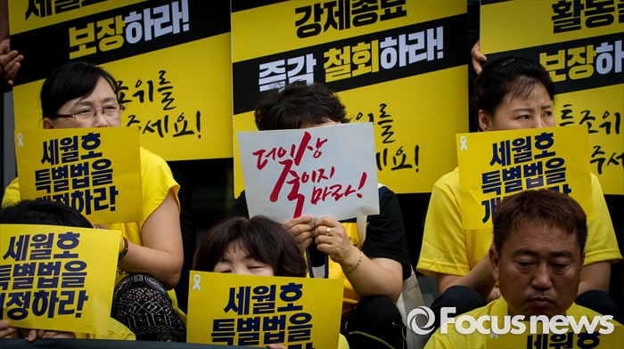 (서울=포커스뉴스) 1일 오전 서울 중구 나라키움저동빌딩 앞에서 열린 '세월호 특조위 성역없는 진상규명 조사 지속 지지 기자회견'에 참석한 416가족협의회와 4.16연대 회원들이 세월호 특별법 개정을 요구하는 손팻말을 들고 있다.