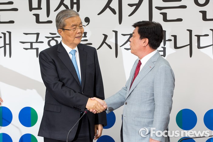 (서울=포커스뉴스) 김종인(왼쪽) 더불어민주당 비상대책위 대표와 박성택 중소기업중앙회 회장이 1일 오전 서울 여의도 국회에서 면담에 앞서 악수 하고 있다.