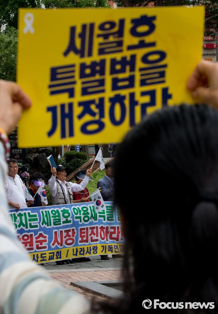 (서울=포커스뉴스) 1일 오전 서울 중구 나라키움저동빌딩 앞에서 열린 '세월호 특조위 성역없는 진상규명 조사 지속 지지 기자회견'에 참석한 4.16연대 회원이 맞은 편에서 반대집회 중인 보수단체를 향해 세월호 특별법 개정을 요구하는 손팻말을 들고 있다.
