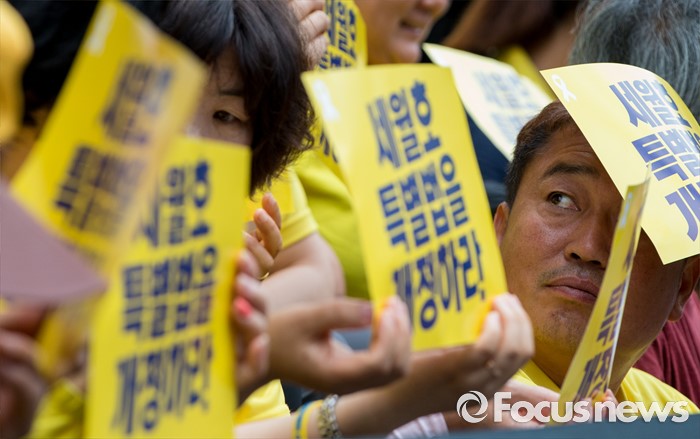 (서울=포커스뉴스) 1일 오전 서울 중구 나라키움저동빌딩 앞에서 열린 '세월호 특조위 성역없는 진상규명 조사 지속 지지 기자회견'에 참석한 416가족협의회와 4.16연대 회원들이 세월호 특별법 개정을 요구하는 손팻말을 들고 있다.