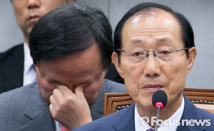 (서울=포커스뉴스) 1일 오전 서울 여의도 국회에서 열린 운영위원회 전체회의에 참석한 김재원 청와대 정무수석이 눈을 만지고 있다. 오른쪽은 이원종 대통령비서실장.