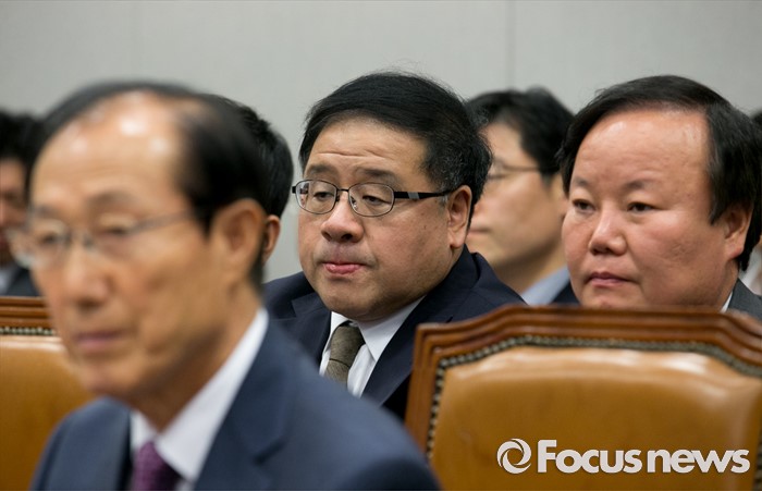 (서울=포커스뉴스) 1일 오전 서울 여의도 국회에서 열린 운영위원회 전체회의에 참석한 이원종(왼쪽) 대통령비서실장 뒤로 안종범(가운데) 청와대 정책조정수석과 김재원 정무수석이 하고 있다.