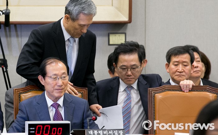 (서울=포커스뉴스) 1일 오전 서울 여의도 국회에서 열린 운영위원회 전체회의에 참석한 김관진 국가안보실장이 자리로 향하고 있다. 왼쪽은 이원종 대통령비서실장.