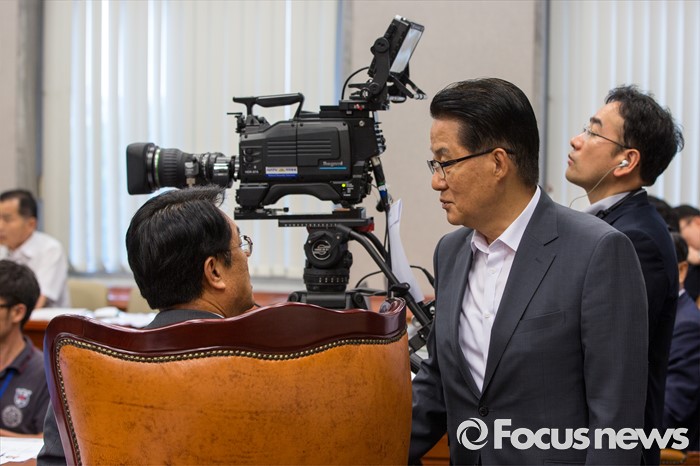(서울=포커스뉴스) 정진석(왼쪽) 국회 운영위원회 위원장과 국회 운영위원회 국민의당 소속 박지원 원내대표가 1일 오전 서울 여의도 국회에서 열린 '운영위원회 전체회의'에 참석해 대화를 나누고 있다.