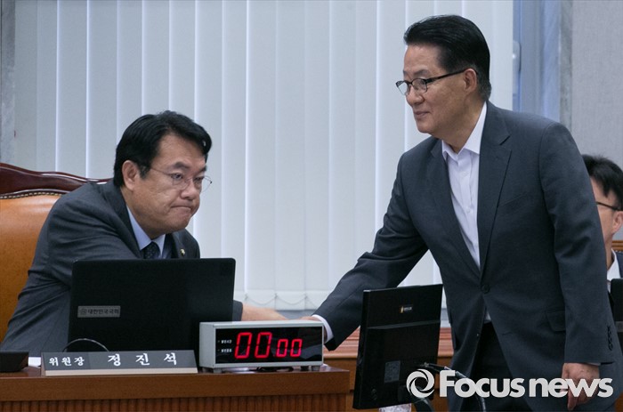 (서울=포커스뉴스) 1일 오전 서울 여의도 국회에서 열린 운영위원회 전체회의에 참석한 정진석(왼쪽) 위원장과 박지원 국민의당 원내대표가 인사하고 있다.