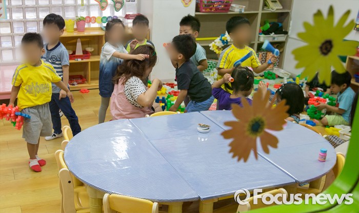 (서울=포커스뉴스) 어린이집을 종일반과 맞춤반으로 나눈 맞춤형 보육 제도가 시행된 1일 서울 성동구 신영창의어린이집에서 원아들이 수업을 하고 있다.