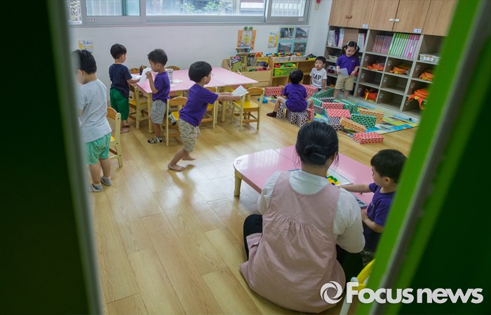 (서울=포커스뉴스) 어린이집을 종일반과 맞춤반으로 나눈 맞춤형 보육 제도가 시행된 1일 서울 성동구 신영창의어린이집에서 원아들이 수업을 하고 있다.