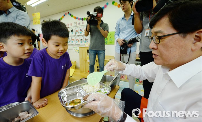 (서울=포커스뉴스) 어린이집을 종일반과 맞춤반으로 나눈 맞춤형 보육 제도가 시행된 1일 서울 성동구 신영창의어린이집을 방문한 정진엽 보건복지부 장관이 원아들에게 배식하고 있다.
