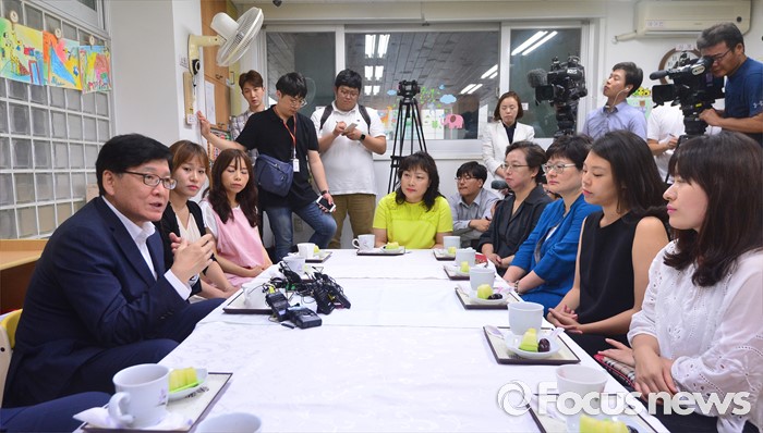 (서울=포커스뉴스) 어린이집을 종일반과 맞춤반으로 나눈 맞춤형 보육 제도가 시행된 1일 서울 성동구 신영창의어린이집을 방문한 정진엽 보건복지부 장관이 보육교사 및 관계자들과 간담회를 갖고 있다.