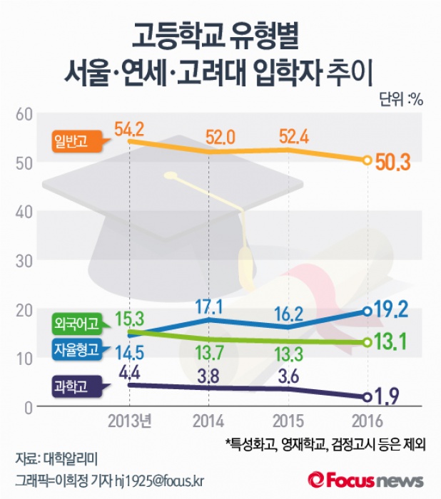 서울대·연세대·고려대의 일반고 출신 입학자 비율을 보면 지난 2013년 54.2%였던 비율이 2014년 52%, 2015년 52.4%에서 올해 50.3%를 기록했다.