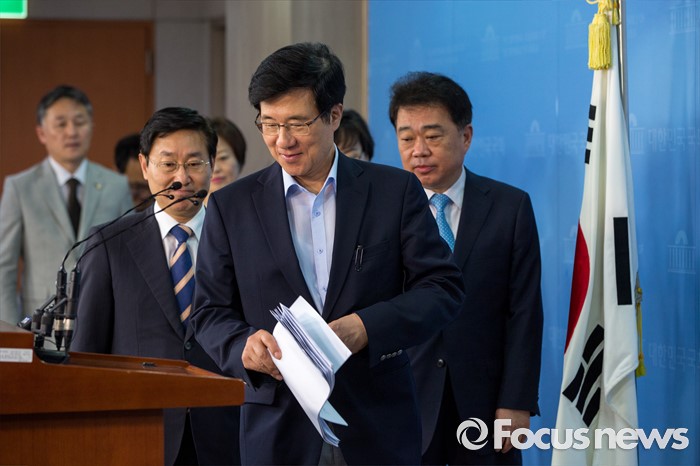 (서울=포커스뉴스) 1일 오후 서울 여의도 국회에서 더불어민주당 공정언론 특위 민주주의회복TF 소속 의원 및 국회 미래창조과학방송통신위원회 소속 의원들이 이정현 새누리당 의원의 청와대 홍보수석 재임시 KBS 보도 개입과 관련한 브리핑을 하기 위해 기자회견장으로 들어서고 있다.