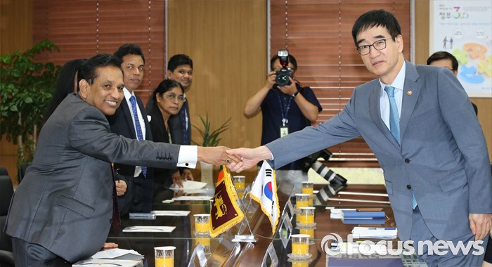 (세종=포커스뉴스) 이준식 사회부총리 겸 교육부장관이 1일 오후 세종시 정부세종청사 교육부 접견실에서 라지따 세나라트너(Rajitha Senaratne) 스리랑카 보건부 장관과 양국의 보건의료분야 교육협력방안을 논의하기 앞서 악수를 하고 있다.