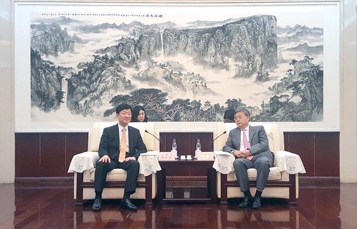(서울=포커스뉴스) 우태희 산업통상자원부 2차관이 1일 중국 산동성 정부청사에서 궈슈칭(郭樹凊) 중국 산동성장과 면담을 갖고, 한-중국 산동성과의 경제통상협력에 관해 의견을 교환하고 있다. <사진제공=산업통상자원부>