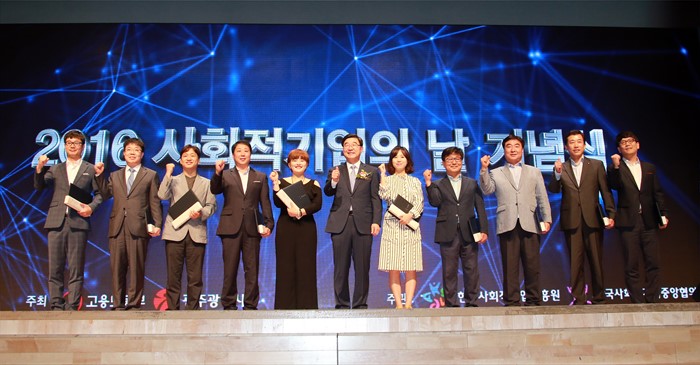 (서울=포커스뉴스) 이기권 고용노동부 장관이 1일 광주 김대중컨벤션센터에서 열린 2016 사회적기업 주간행사 및 사회적경제 박람회에 참석, 사회적기업 육성에 힘써온 이들에게 정부 포상을 수여하고 기념촬영을 하고 있다. <사진제공=고용노동부>