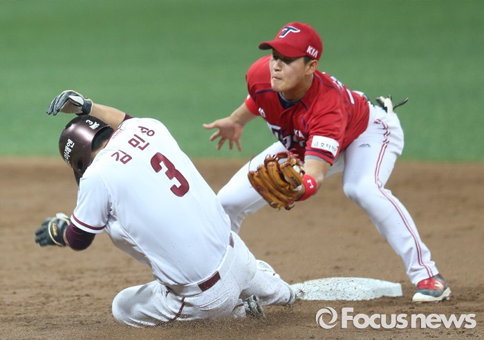 (서울=포커스뉴스) 1일 서울 고척 스카이돔에서 열린 2016 프로야구 KIA-넥센 경기 2회말 1사 1루에서 넥센 1루주자 김민성이 이택근 타석떄 2루 도루를 시도하다 아웃되고 있다.