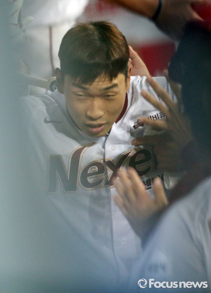 (서울=포커스뉴스) 1일 서울 고척 스카이돔에서 열린 2016 프로야구 KIA-넥센 경기 4회말 무사 2루에서 넥센 고종욱이 우월 2점 홈런을 치고 덕아웃에서 동료들의 축하를 받고 있다.