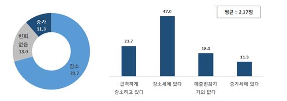 또, 협력중소기업 10곳 중 7곳(70.7%)은 최근 3년간 매출액이 감소했으며, 이에 따라 4곳 이상(43%)이 근로인원을 감축한 것으로 나타났다. 매출액 감소율은 평균 30%에 육박했으며, 감원율은 29%나 됐다.