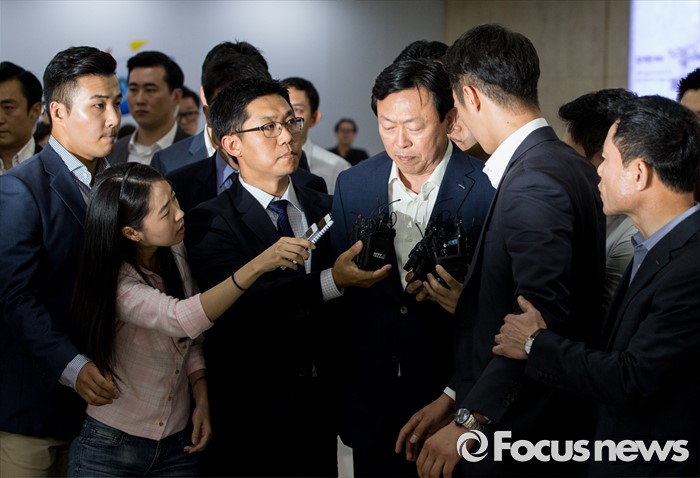 (서울=포커스뉴스) 신동빈 롯데그룹 회장이 3일 오후 서울김포공항을 통해 귀국, 취재진의 질문에 답하고 있다. 신 회장은 이날 기자들에게 최근 롯데그룹을 둘러싼 일련의 사태에 대해 "죄송하다"고 공식 사과 했다.