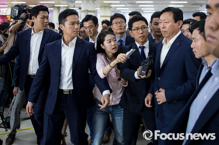 (서울=포커스뉴스) 신동빈 롯데그룹 회장이 3일 오후 서울김포공항을 통해 귀국, 취재진의 질문에 답하고 있다. 신 회장은 이날 기자들에게 최근 롯데그룹을 둘러싼 일련의 사태에 대해 "죄송하다"고 공식 사과 했다.