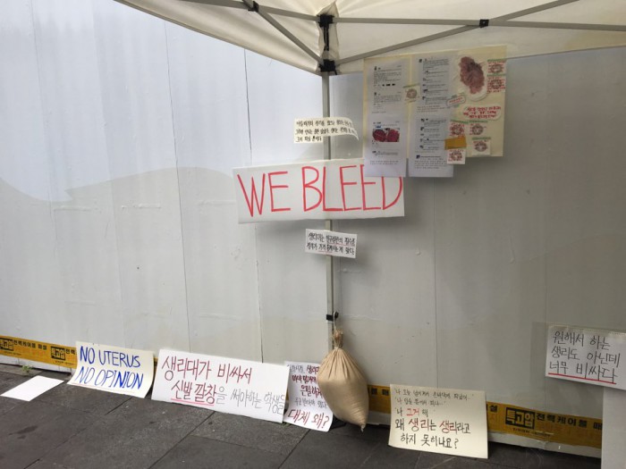 또 행사장 곳곳에는 "임신과 출산은 고귀하지만 생리는 숨겨야할 부끄러운 일입니까", "원해서 하는 생리도 아닌데 너무 비싸다", "생리대는 인구절반의 필수품, 정부가 가격 통제하는 게 맞다"라는 글귀가 적힌 피켓이 걸렸다.