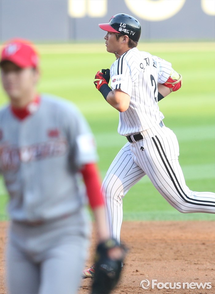 (서울=포커스뉴스) 3일 서울 잠실구장에서 열린 2016 프로야구 SK-LG 경기 2회말 2사후 LG 오지환이 우월 솔로 홈런을 치고 베아스를 돌고 있다.