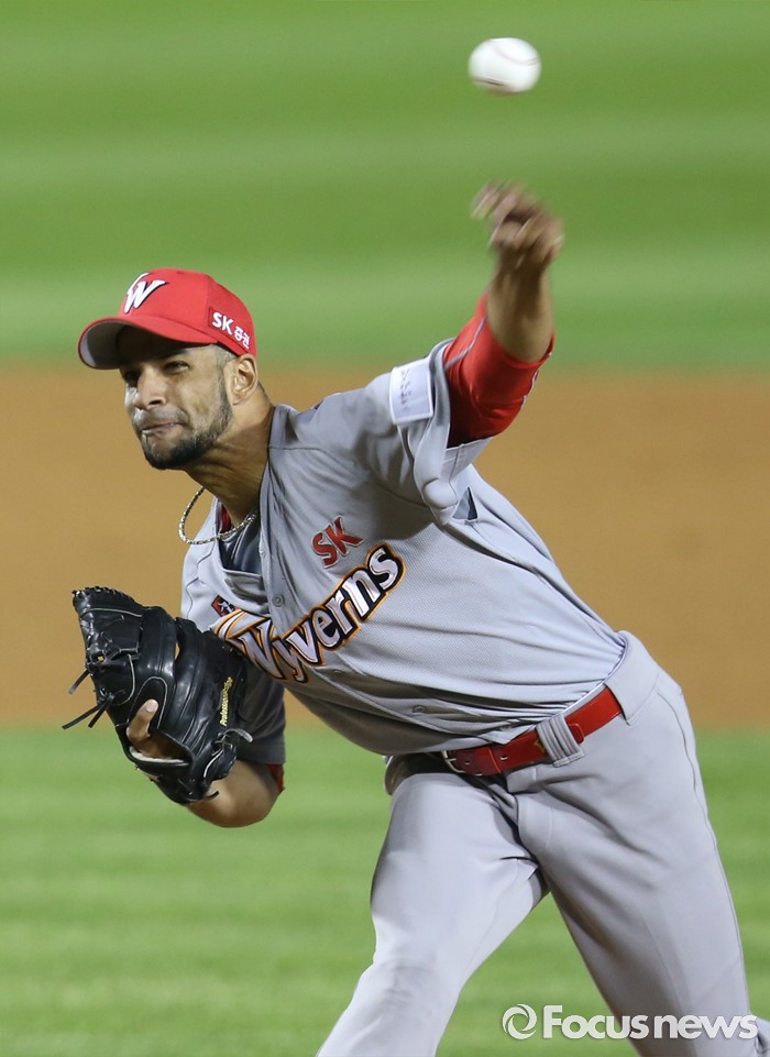 (서울=포커스뉴스) 3일 서울 잠실구장에서 열린 2016 프로야구 SK-LG 경기에서 SK 투수 라라가 6회말 구원 등판해 투구하고 있다.