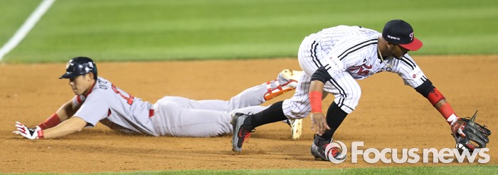 | △ 3루에서 슬라이딩하는 SK 이명기 |