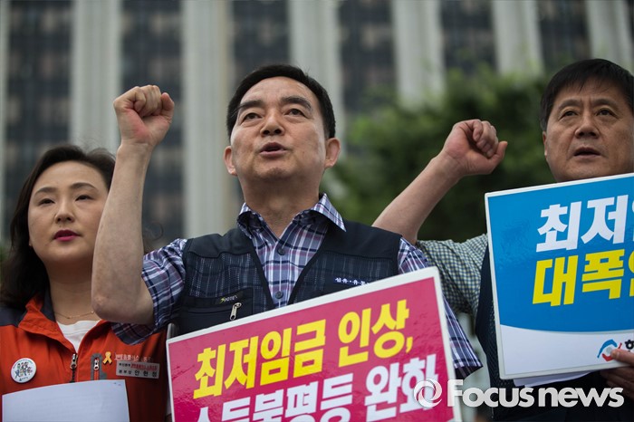 (서울=포커스뉴스) 4일 오전 서울 종로구 정부서울청사 앞에서 양대노총의 최저임금 대폭인상 및 노동자위원 중대 결단을 예고하는 기자회견이 열리고 있다.