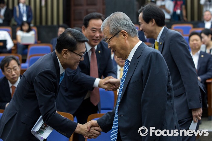 (서울=포커스뉴스) 김종인(오른쪽) 더불어민주당 비상대책위 대표와 우상호(오른쪽 두 번째) 원내대표가 4일 오전 서울 여의도 국회에서 열린 의원총회에 참석해 동료 의원들과 악수 하고 있다.