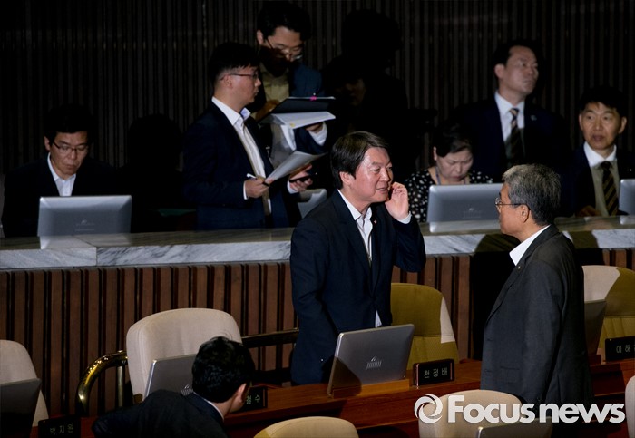 (서울=포커스뉴스) 4일 오전 서울 여의도 국회에서 열린 343회 국회(임시회) 6차 본회의, 경제에 관한 대정부 질문에 참석한 안철수(왼쪽) 국민의당 전 대표와 김동철 의원이 대화하고 있다.