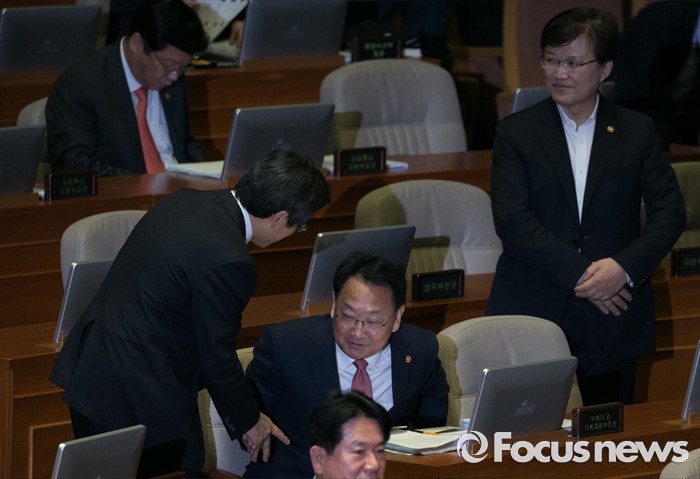 (서울=포커스뉴스) 4일 오전 서울 여의도 국회에서 열린 343회 국회(임시회) 6차 본회의, 경제에 관한 대정부 질문에 참석한 황교안(왼쪽) 국무총리와 유일호(가운데) 경제부총리 겸 기획재정부 장관이 인사하고 있다.