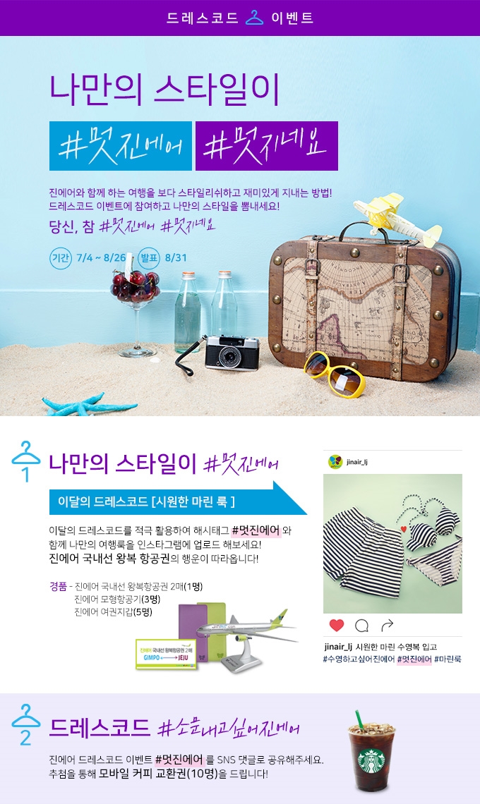 '#멋진에어'는 진에어가 제시한 드레스코드에 맞춘 옷차림을 촬영해 SNS에 올리면 경품을 증정하는 이벤트다. 이번 드레스코드는 바다와 관련있는 모티프를 활용한'마린룩'이다.