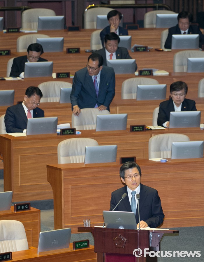 (서울=포커스뉴스) 4일 오전 서울 여의도 국회에서 열린 343회 국회(임시회) 6차 본회의, 경제에 관한 대정부 질문에 참석한 황교안 국무총리가 이종구 새누리당 의원의 질문에 답하고 있다.