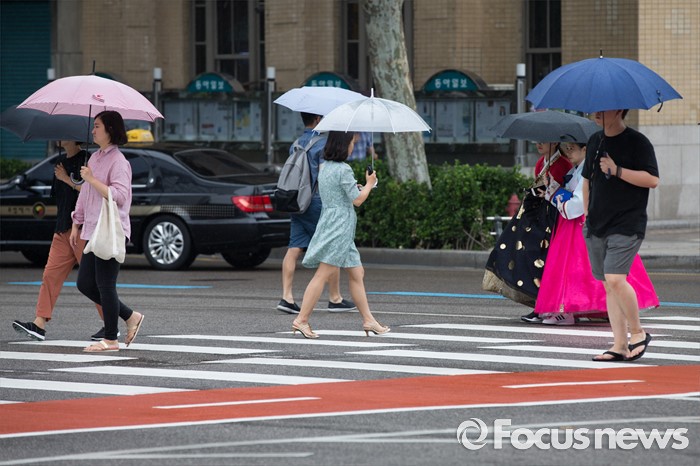 (서울=포커스뉴스) 전국에 호우주의보가 내려진 4일 오전 서울 종로구 광화문 광장에서 시민들이 우산을 쓰고 횡단보도를 걷고 있다.