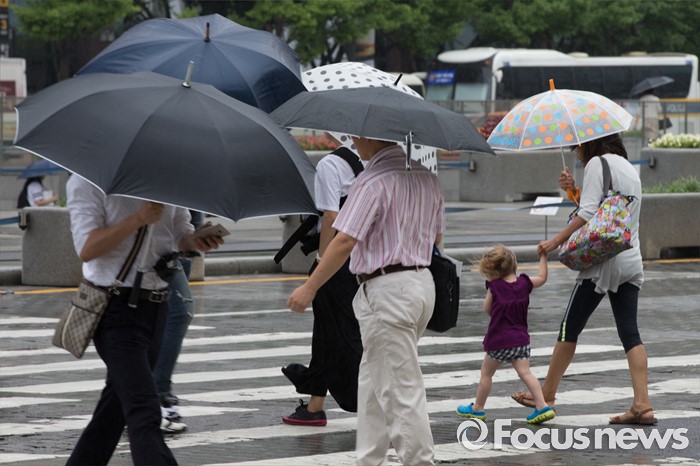 (서울=포커스뉴스) 전국에 호우주의보가 내려진 4일 오전 서울 종로구 광화문 광장에서 시민들이 우산을 쓰고 횡단보도를 걷고 있다.