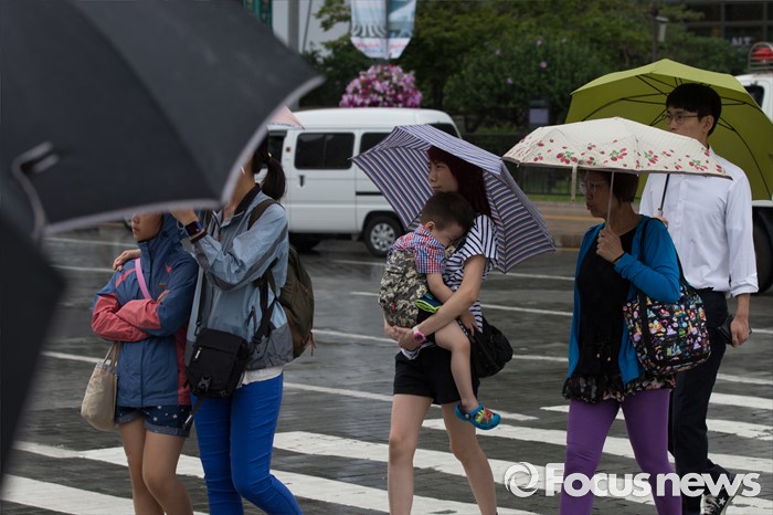 (서울=포커스뉴스) 전국에 호우주의보가 내려진 4일 오전 서울 종로구 광화문 광장에서 시민들이 우산을 쓰고 횡단보도를 걷고 있다.