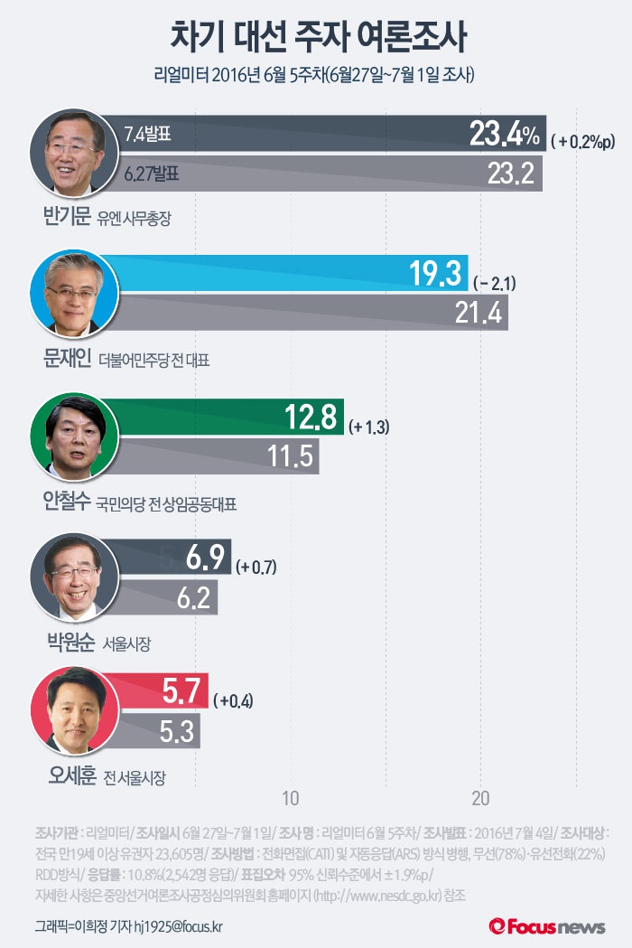 (서울=포커스뉴스) 여론조사 전문기관 리얼미터가 4일 발표한 6월 5주차 주간집계에 따르면 문재인 더불어민주당 전 대표의 약세 속에 반기문 유엔사무총장과 안철수 국민의당 전 상임공동대표의 지지율이 2주 연속 상승한 것으로 조사됐다.