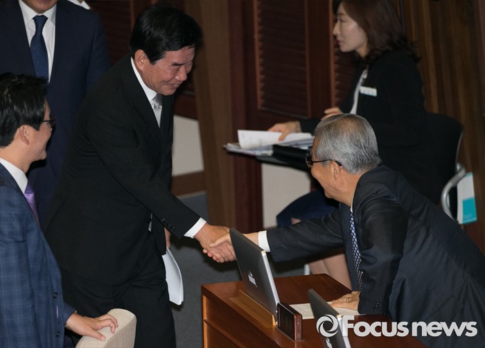 (서울=포커스뉴스) 4일 오전 서울 여의도 국회에서 열린 343회 국회(임시회) 6차 본회의, 경제에 관한 대정부 질문에 참석한 김진표(왼쪽) 더불어민주당 의원이 대정부 질문을 마친 뒤 김종인 비대위 대표와 악수하고 있다.