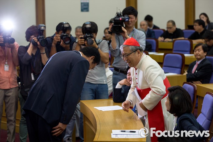 (서울=포커스뉴스) 염수정(가운데) 추기경과 정진석 새누리당 원내대표가 4일 오전 서울 여의도 국회의원회관에서 열린 '생명존중포럼 창립총회'에 참석해 인사 하고 있다.
