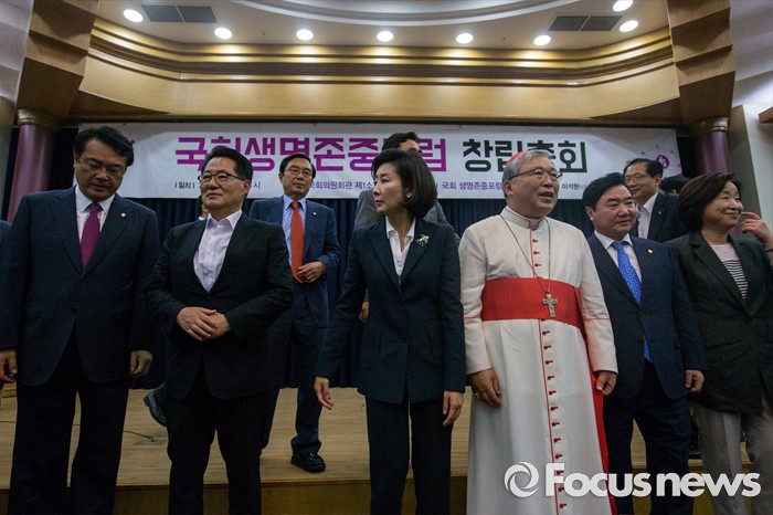 (서울=포커스뉴스) 염수정(왼쪽 네 번째) 추기경을 비롯한 국회 카톨릭교우회 소속 의원들이 4일 오전 서울 여의도 국회의원회관에서 열린 '생명존중포럼 창립총회'에 참석해 총회를 마친 뒤 사진촬영을 하고 있다. 왼쪽부터 정진석 새누리당 원내대표, 박지원 국민의당 비상대책위원장, 나경원 새누리당 의원, 염수정 추기경, 이석현 더불어민주당 의원, 심상정 정의당 상임대표.