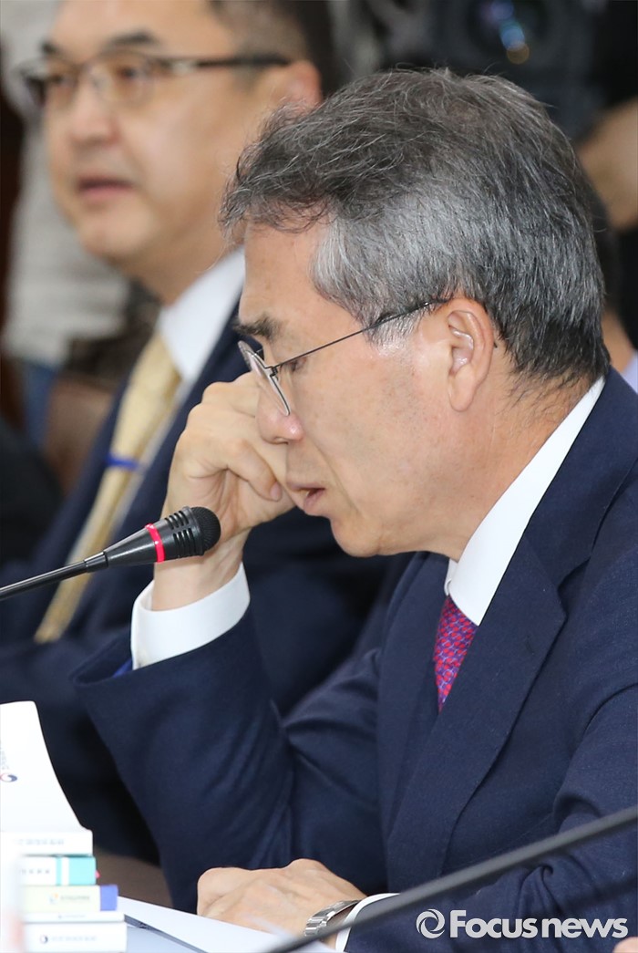 (세종=포커스뉴스) 4일 오후 세종시 정부세종청사 고용노동부 최저임금위원회 전원회의실에서 열린 제8차 전원회의에서 박준성 위원장이 회의중 생각에 잠겨 있다.