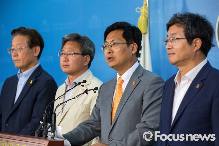 (서울=포커스뉴스) 경기지역 시장들이 4일 오후 서울 여의도 국회에서 행정자치부의 지방재정법 시행령 개정안 입법예고 철회를 촉구하는 기자회견을 하고 있다. 왼쪽부터 이재명 경기도 성남시장, 채인석 경기도 화성시장, 최성 경기도 고양시장, 염태영 경기도 수원시장.