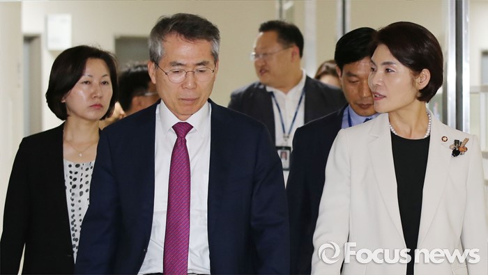 (세종=포커스뉴스) 박준성(왼쪽 두 번째) 위원장과 한정애(오른쪽) 국회 환노위 더불어민주당 간사와 송옥주(왼쪽) 의원이4일 오후 세종시 정부세종청사 고용노동부 최저임금위원회 전원회의실에서 열린 제8차 전원회의를 방문하고 있다.