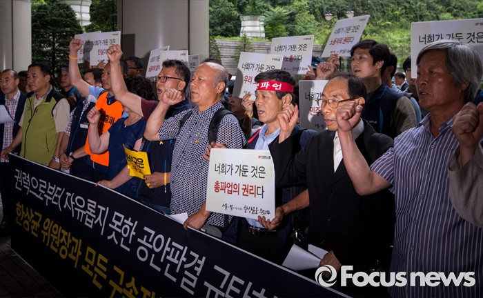 (서울=포커스뉴스) 4일 오후 서울중앙지법 앞에서 한상균 민주노총 위원장의 1심 선고 공판 후 열린 기자회견에 참석한 최종진 부위원장 및 조합원들이 판결의 부당함을 주장하는 구호를 외치고 있다. 지난해 11월 열린 민중총궐기 대회 불법 시위 주도 혐의로 기소된 한 위원장은 이날 열린 1심 재판에서 징역 5년을 선고받았다.
