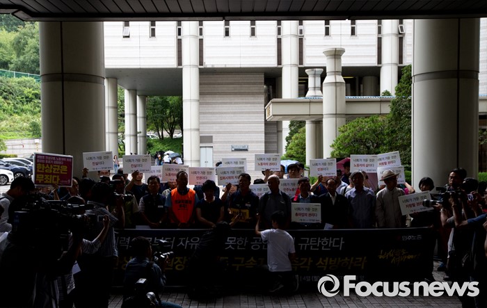 (서울=포커스뉴스) 4일 오후 서울중앙지법 앞에서 한상균 민주노총 위원장의 1심 선고 공판 후 열린 기자회견에 참석한 최종진 부위원장이 판결의 부당함을 주장하고 있다. 지난해 11월 열린 민중총궐기 대회 불법 시위 주도 혐의로 기소된 한 위원장은 이날 열린 1심 재판에서 징역 5년을 선고받았다.