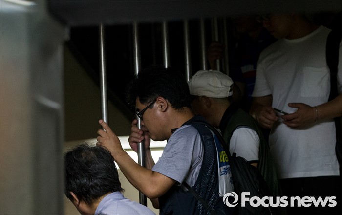 (서울=포커스뉴스) 4일 오후 서울중앙지법 5번 출입구 앞에서 민주노총 조합원 및 관계자들이 한상균 위원장의 1심 선고 공판을 방청 후 퇴장하기 위해 줄지어 기다리고 있다. 지난해 11월 열린 민중총궐기 대회 불법 시위 주도 혐의로 기소된 한 위원장은 이날 열린 1심 재판에서 징역 5년을 선고받았다.