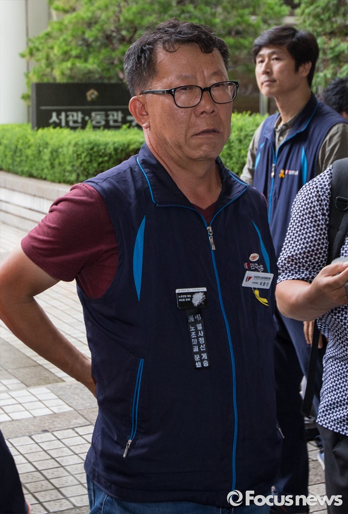 (서울=포커스뉴스) 4일 오후 서울중앙지법 앞에서 한상균 민주노총 위원장의 1심 선고 공판 후 열린 기자회견을 마친에 참석한 최종진 부위원장이 굳은 표정을 짓고 있다. 지난해 11월 열린 민중총궐기 대회 불법 시위 주도 혐의로 기소된 한 위원장은 이날 열린 1심 재판에서 징역 5년을 선고받았다.