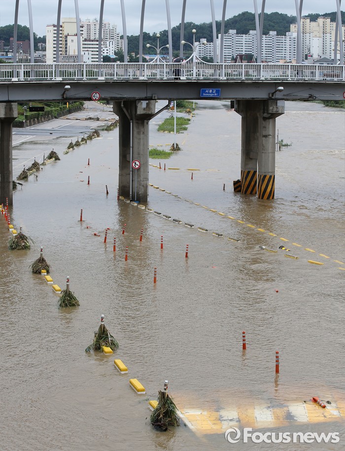 (청주=포커스뉴스) 충청 및 중부지역에 호우경보가 발생한 4일 오후 충북 청주시 무심천 하상도로가 내린비로 잠겨 있다.