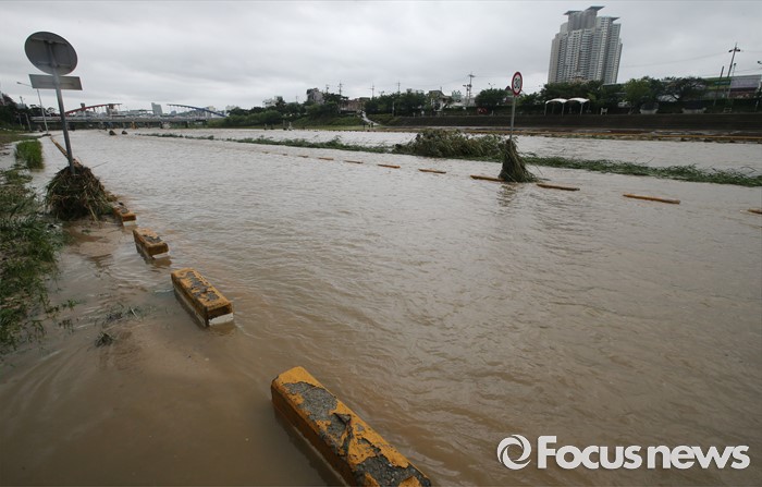 (청주=포커스뉴스) 충청 및 중부지역에 호우경보가 발생한 4일 오후 충북 청주시 무심천 하상도로가 내린비로 잠겨 있다.